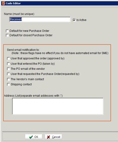 4. In the Code Editor window (image below) you will see all the options for who will receive the email for that status.