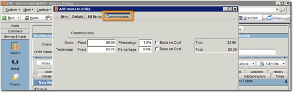 When adding an item to the order or proposal with the Price Book selected, the commission tab is filled out based on the commission defined in the Price Book.