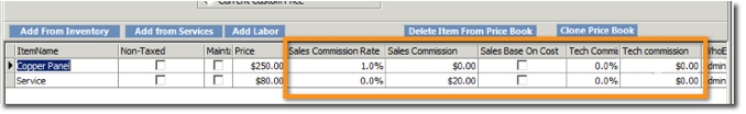The Price Book below has two items on it. Each item has a commission percentage or flat rate commission assigned.