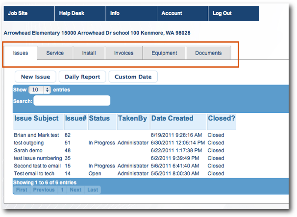 If you would like your customer to enter a new service order, install order, or issue, they can go to the corresponding tab and click New Service, New Install, or New Issue. You can hide the New Service, New Install and New Issue buttons if you do not want them to be able to enter records.