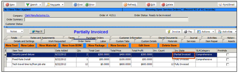 3) Notice the order changes from Invoiced to Partially Invoiced. Also notice Inv State on the item changes from Fully Invoiced to Partial Invoiced (Image below).