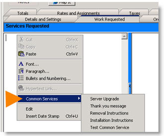 Your SME Administrator may have set up common services to use when filling out the work requested tab. Common services are templates which can be inserted into this tab.