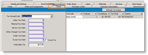 View the tax details on the Taxes tab. The Tax Group/Code is assigned in the customer record. When you create an order for a customer, the TaxGroup/Code will be populated by what is assigned in the customer record.