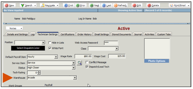 3. Click the Technician Settings tab. Locate the Warehouse field and select the warehouse you use for your technician's truck. (image below)