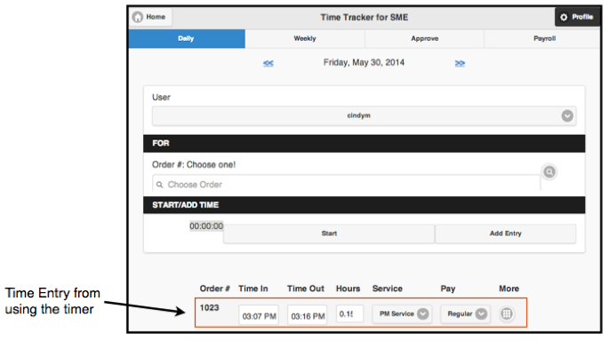 If you choose to use the timer in the Start/Add Time section, you will need to click Start. You will see the time tracked. Click Stop Order #____