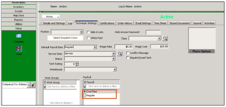 When the techs are entering time in Time Tracker, this will be their default cost per hour. They would have the ability to change the time they are entering to any other payroll item that they are added to. For Cindy, she has been added to payroll items of “Regular” and “Overtime”. These are her two options when entering time.