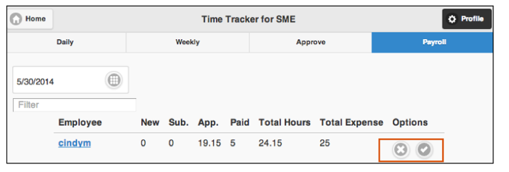 On the Payroll tab you can move the approved time to paid. Click individually on each line or at the bottom click Refuse All or Pay All